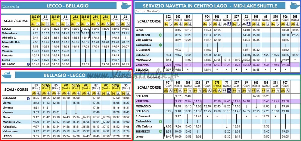 Vous avez aussi un bateau qui part de Varenna à 9h56 et arrive à Menaggio à 10h10, puis à Bellagio à 10h30, puis file directement à Villa Carlotta à 10h40, et 10h45 pour Tremezzo et pour finir 10h55 à Lenno. Vous avez aussi l’encadré bleu qui vous permet de voir que vous avez un bateau qui part de Varenna à 12h53 et arrive à Menaggio à 13h05, ou un bateau qui arrive à Varenna à 15h05 et arrive à Menaggio à 15h23, ou un bateau qui arrive à 12h30 à Varenna et arrive à Bellano à 12h44.