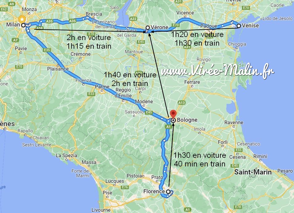 - Depuis Vérone, vous êtes à 1 h 40 de Bologne en voiture et à 2 heures en train en passant par Padova (Padoue)