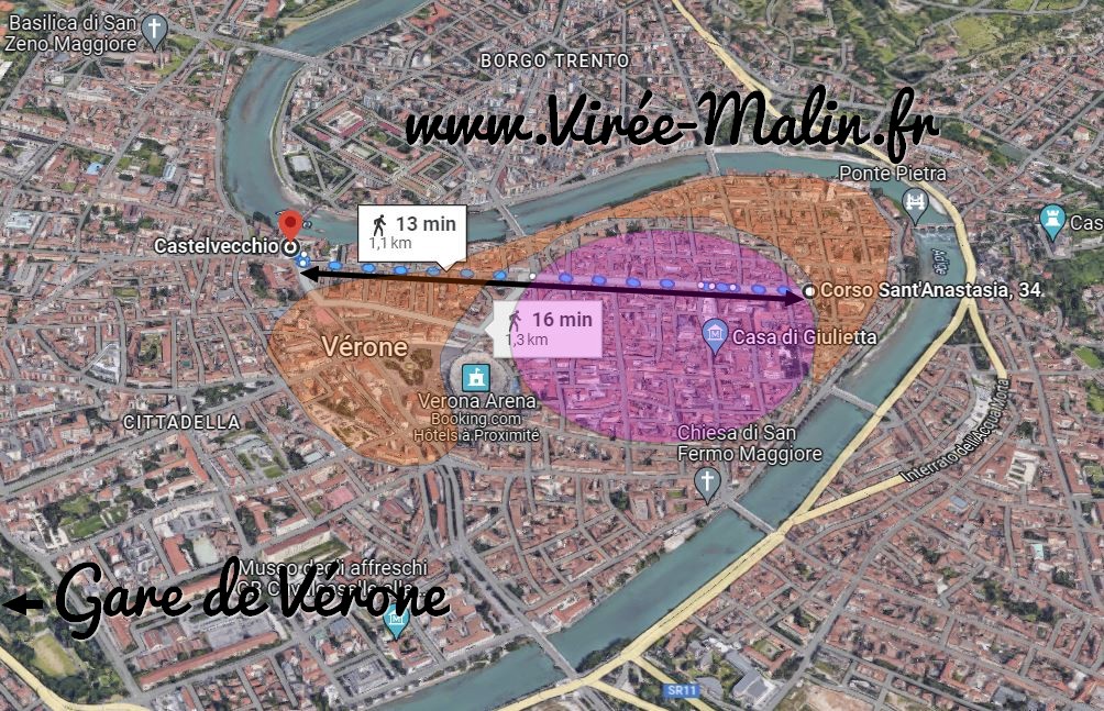 - Cliquez ici pour voir les logements qui se trouvent dans ces zones (orange ou violette pour être idéalement placé pour visiter Vérone et pour sortir le soir) :