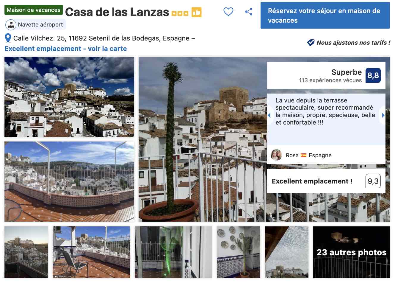 Côté hébergement, je vous conseille non pas de privilégier l’hôtel, mais de vous faire plaisir en réservant la maison de vacances La Casa de las Lanzas. Pour moins d’une cinquantaine d’euros la nuit, vous bénéficierez d’une vue panoramique sur le village blanc de Setenil de las Bodegas. En plus, il vous situera à proximité des bars et restaurants du village avec, en prime, une place de parking.