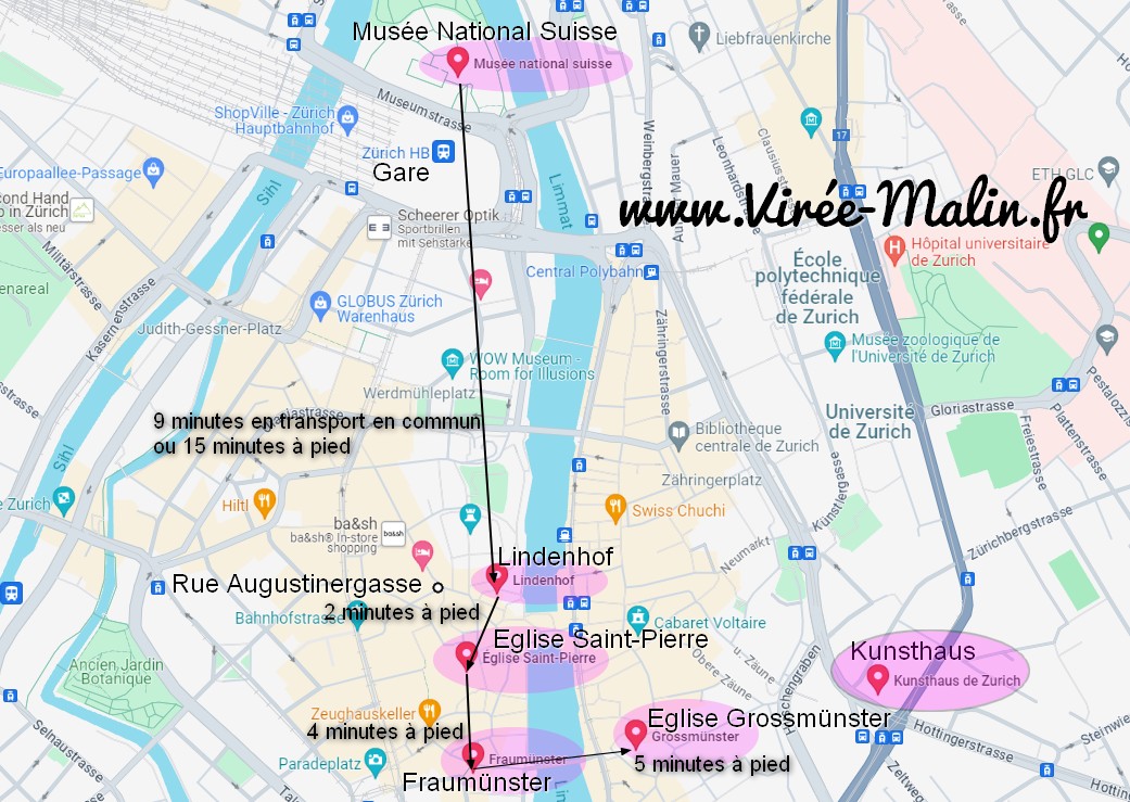 Pour bien visiter Zurich je vous conseille de loger dans le centre historique de Zurich, ce qui vous permettra de faire l’ensemble des visites culturelles à pied et de profiter des bars et restaurants en fin de journéée. Pour plus de détails et de suggestions de logement, allez voir mon article Où dormir à Zurich ou je vous explique tout.