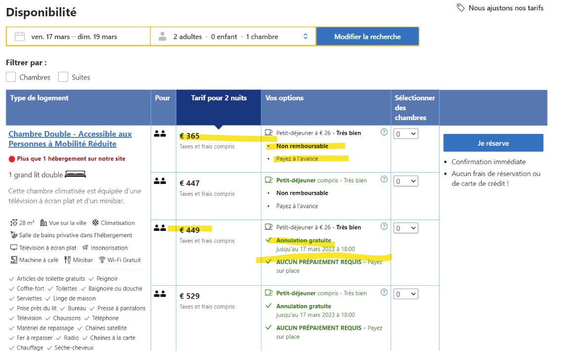 Jetez un œil aussi au site Weekendesk.fr, j’ai fait quelques recherches comparatives et ils proposent des prix vraiment intéressants. Par exemple, prenons l’Hôtel Parc Beaumont & Spa Pau – MGallery qui se trouve proche de Pau et comparons l’offre sur ce même hôtel sur weekendesk. Sur Booking voilà les tarifs pour 2 nuits au mois de Mars, l’offre de booking à 365€ est payable immédiatement et non remboursable et comporte uniquement la chambre.