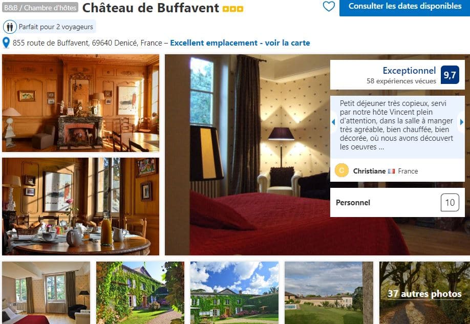 Si vous ne savez pas où dormir, je vous conseille de comparer les offres sur le site Booking. À 40 minutes de Lyon, le Château de Buffavent me fait de l’œil depuis un moment. Je ne l’ai pas testé, mais les avis sont vraiment excellents. Romantisme, dégustation des crus du domaine, piscine… Tous les ingrédients sont réunis pour un séjour réussi.