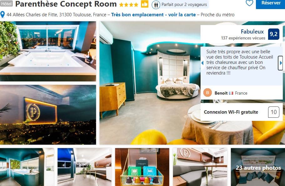 Un internaute m’a récemment conseillé une chambre parfaite pour faire une surprise à son/sa bien-aimé(e). Ça s’appelle Parenthèse Concept Room et le concept en question est très sympa : une vue panoramique sur les toits de Toulouse, un jacuzzi dans la chambre, un lit tout rond…