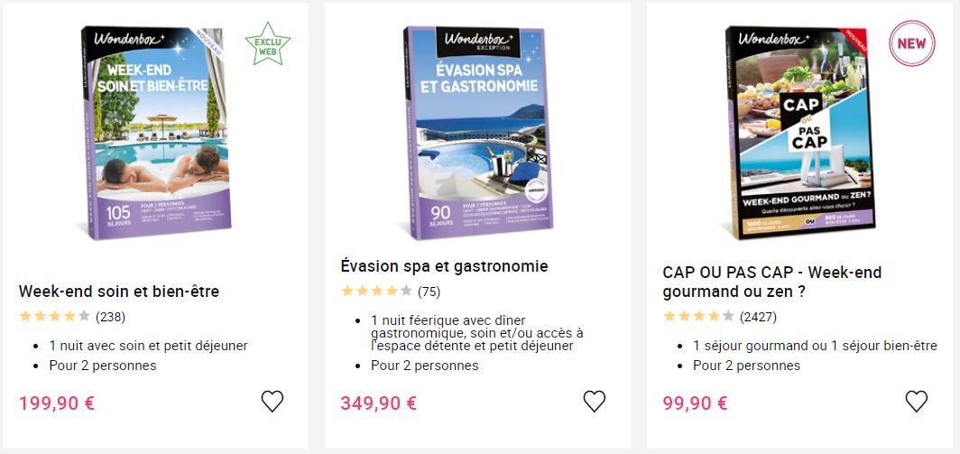 Week-end en amoureux, activité sportive, séjour bucolique, soirée gastronomique, spectacle, divertissement, séance détente et bien-être, il y en a pour tous les goûts et pour toutes les destinations (cliquez ici pour voir les offres sur WonderBox).